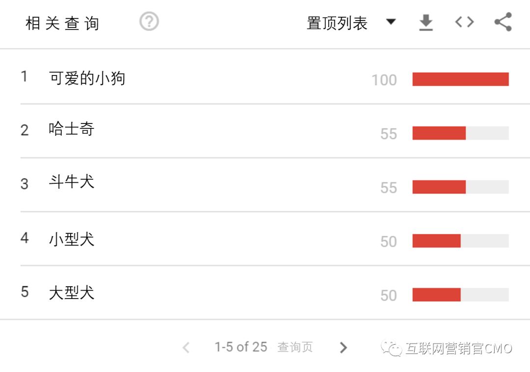 谷歌趋势会根据与关键字规划师不同的标准来推荐新的关键字。例如,它会突出显示最近流行度最高的相关搜索查询(再次使用“狗”的示例),如以下屏幕截图所示: