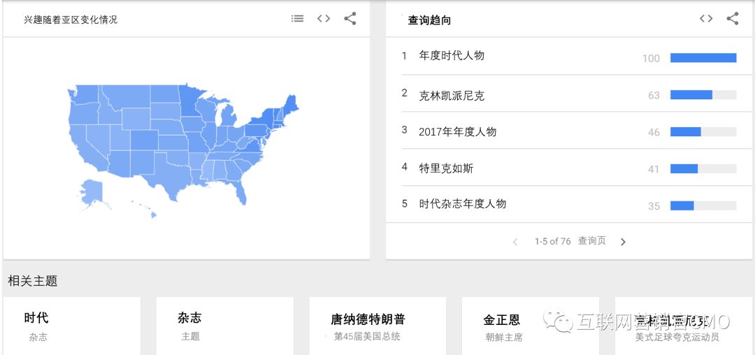 通过显示国家,相关查询和相关主题的搜索兴趣进一步分析: